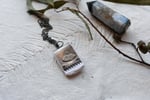 Measuring 4cm long x 2.5cm wide and comes with a silver chain.