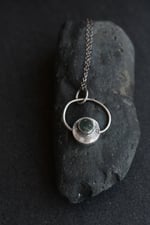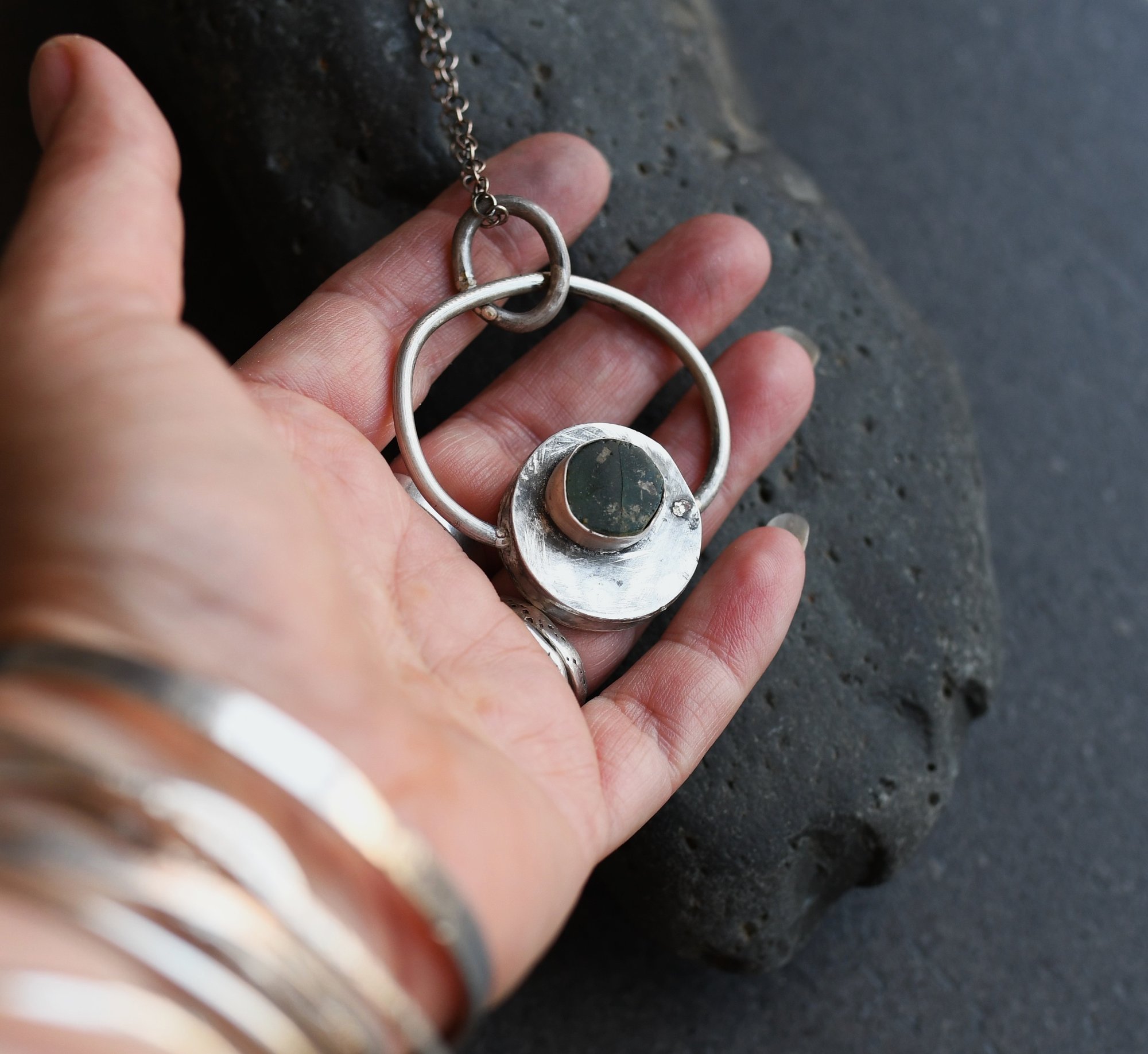 This necklace is inspired by the infinity of circles within circles and spiralling spiritual energy. This piece is made from a hollow form circle in the centre, featuring a Ancient Roman Glass dating back to over 2000 years.
