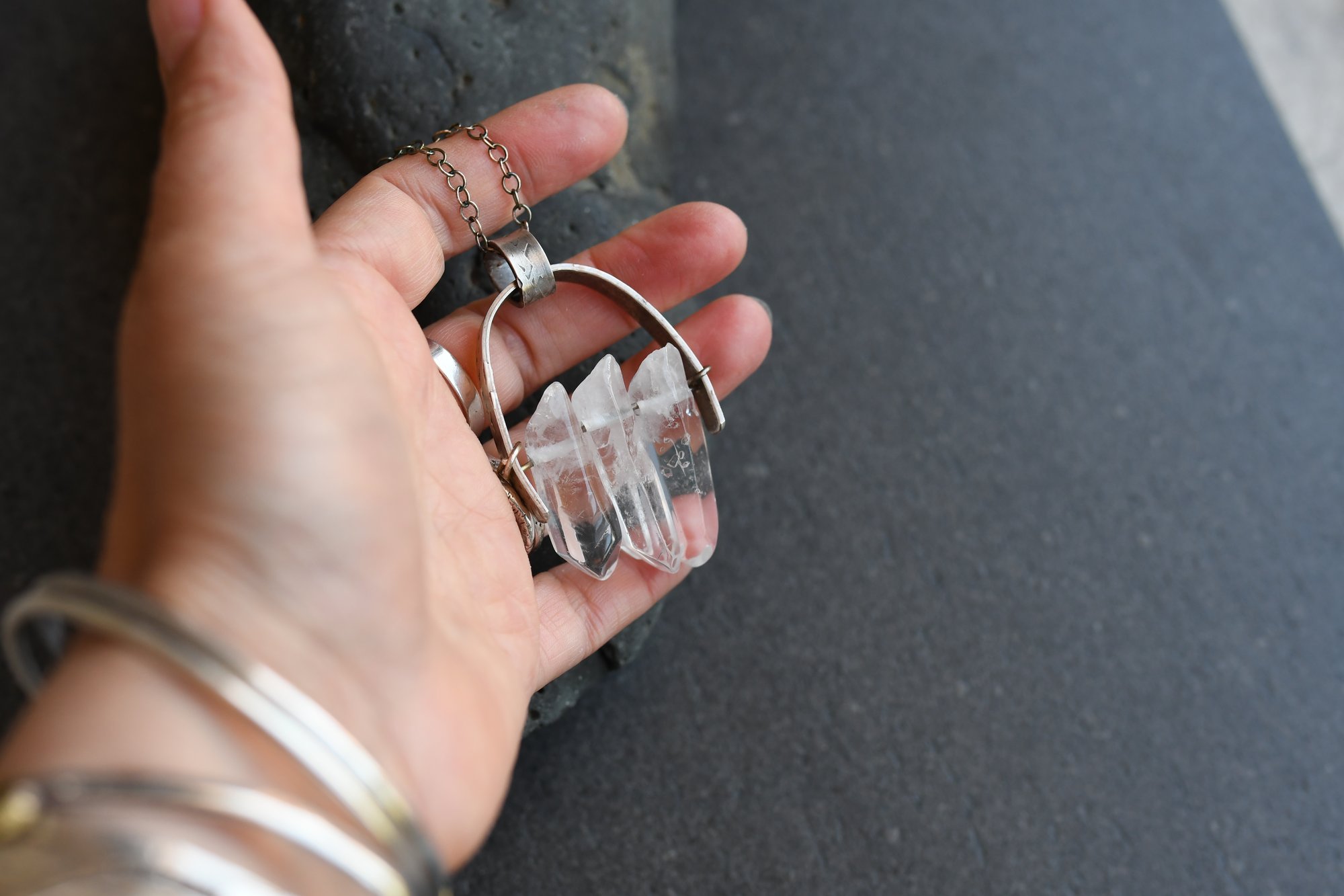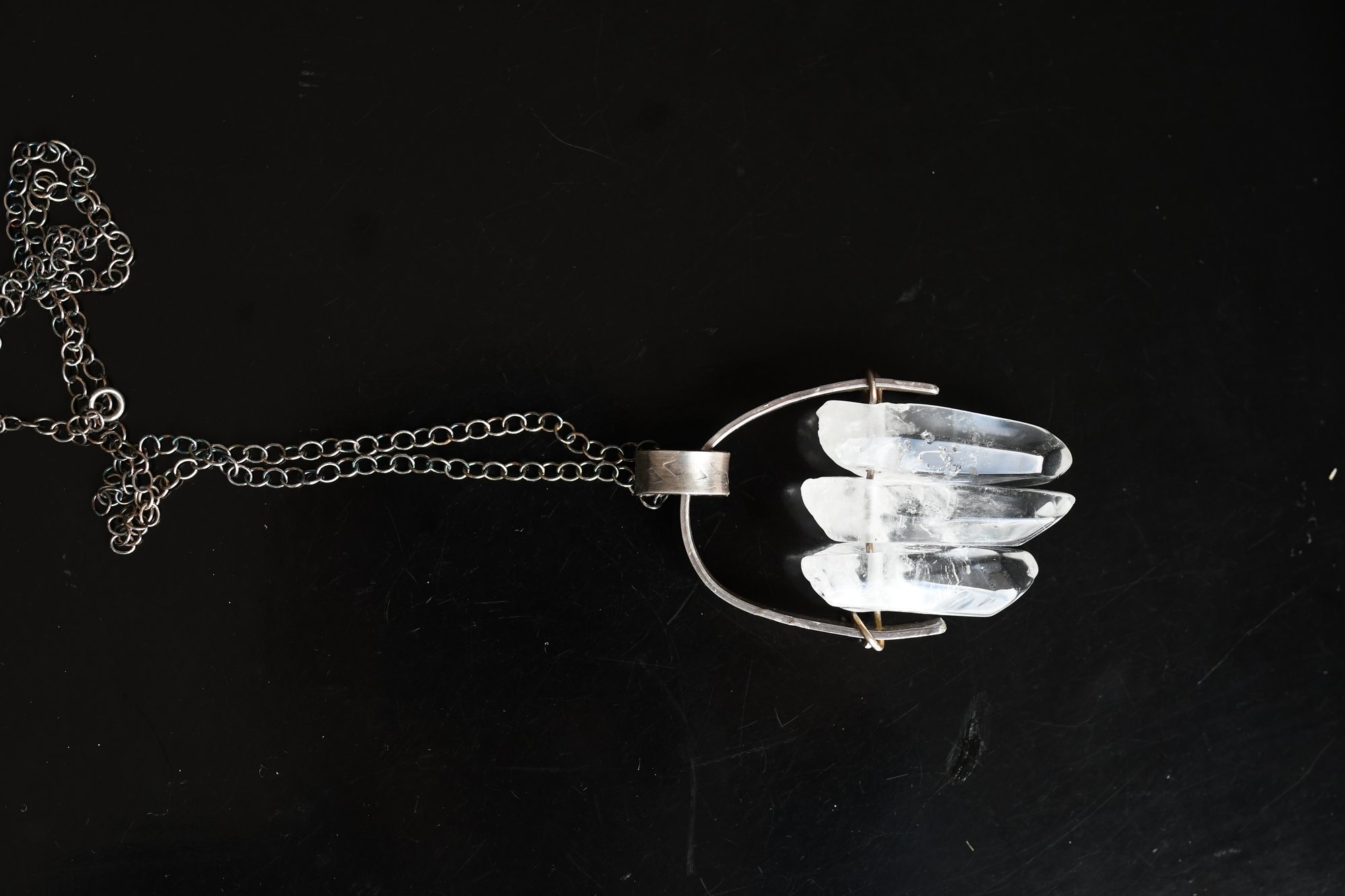 These three clear quartz crystal points are centred in this silver necklace to amplify energy and create a focused clarity. Clear quartz is the master healer and cleanser of unwanted energies.