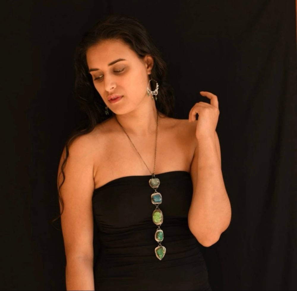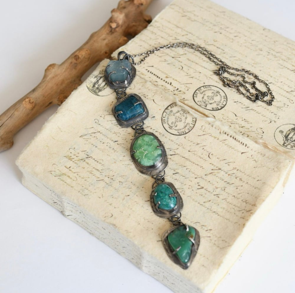With oceanic blues and earthy greens it is symbolic of our fragile ecosystem. This totem is about keeping the peace between us and our beautiful world. She amplifies the healing qualities of blues and greens of our planet, featuring various gemstones.