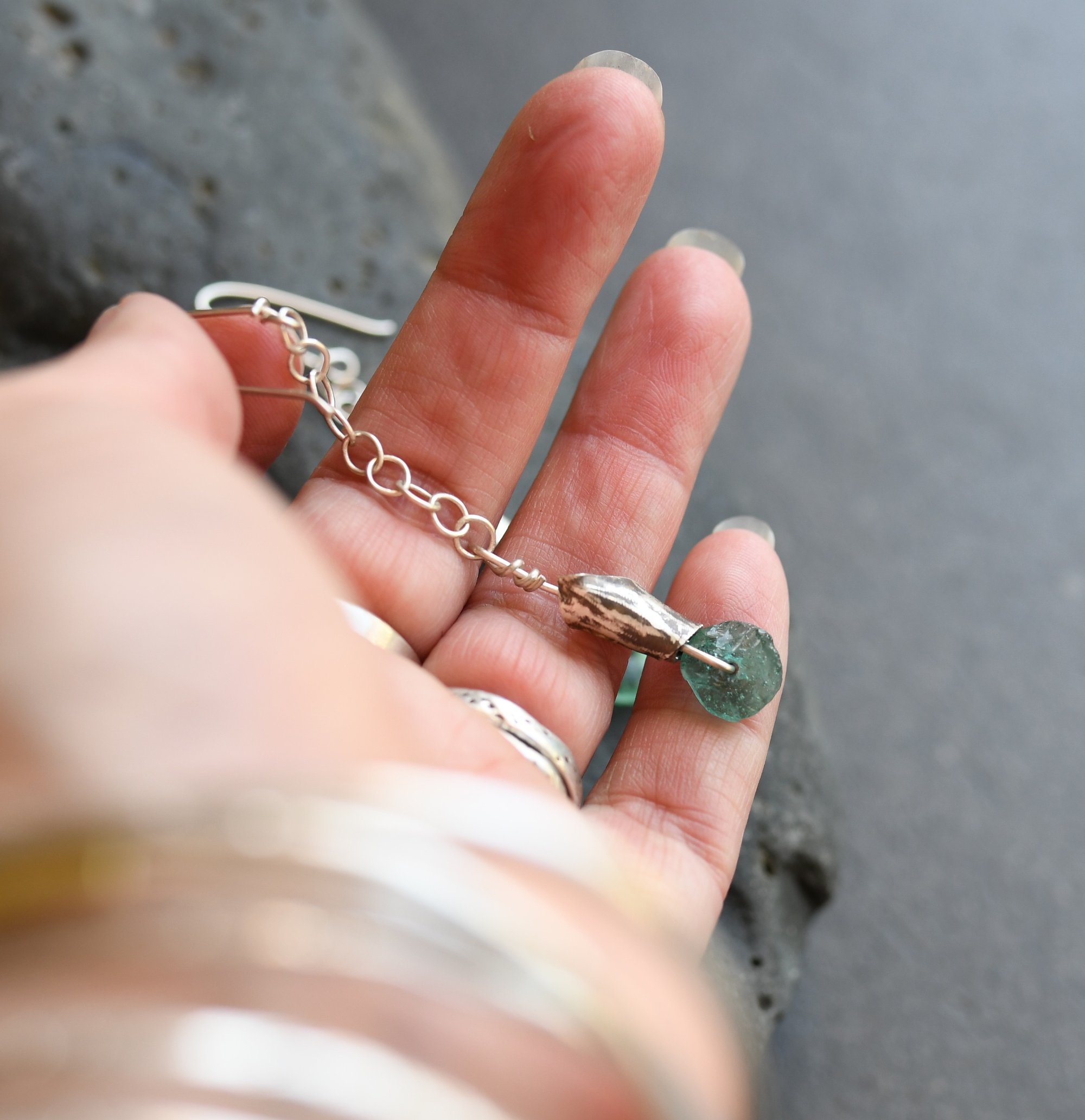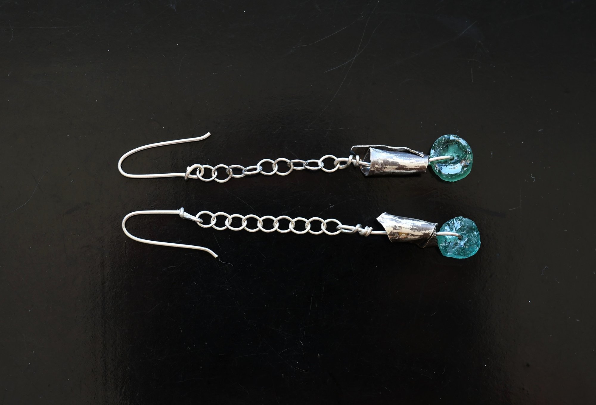 These earrings are raw and rustic echoing the road these glass pieces have travelled.